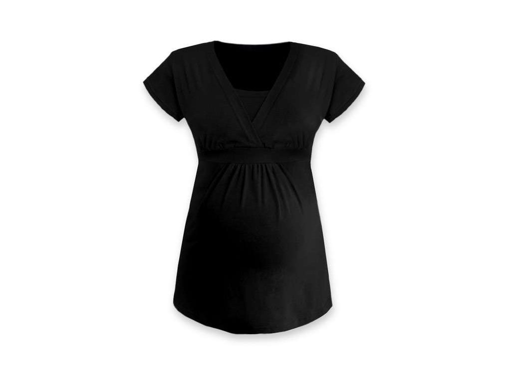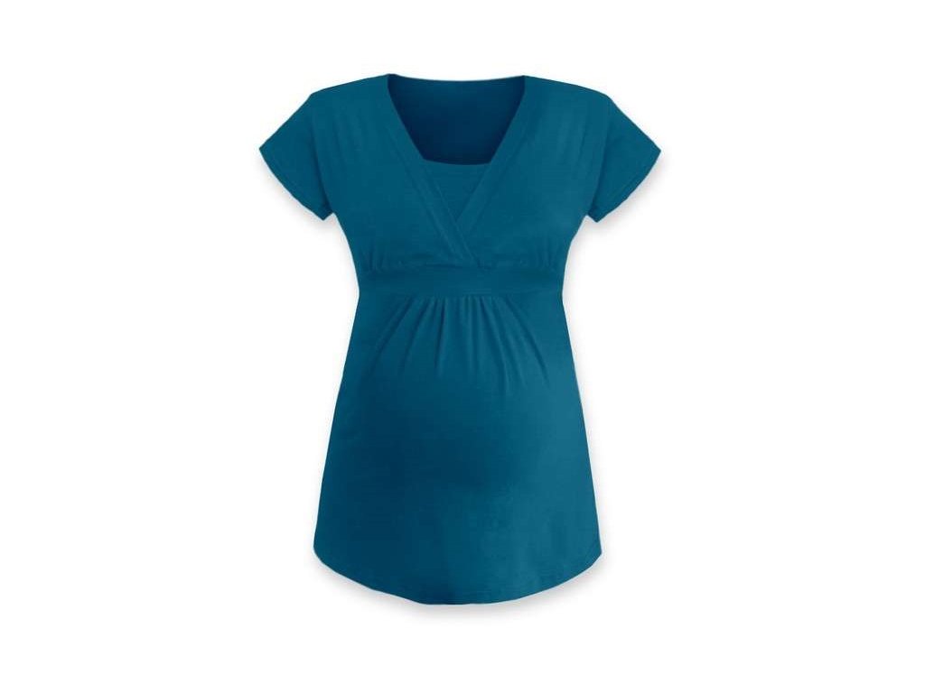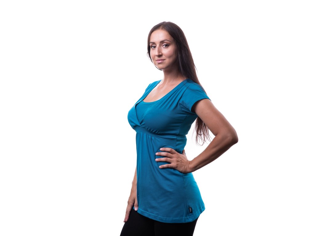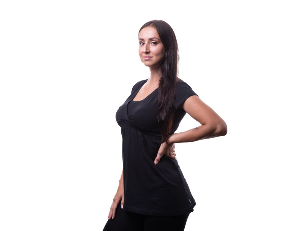 Tunika dole rozšířená do "A", se vsadkou pro diskrétní a pohodlné kojení. Řasení nahoře na bříšku umožňuje velkou roztažnost tuniky i v těhotenství a po porodu skryje tento volný střih předního dílu bříško.