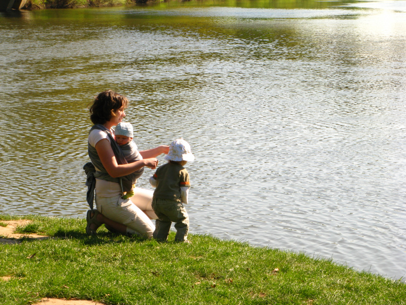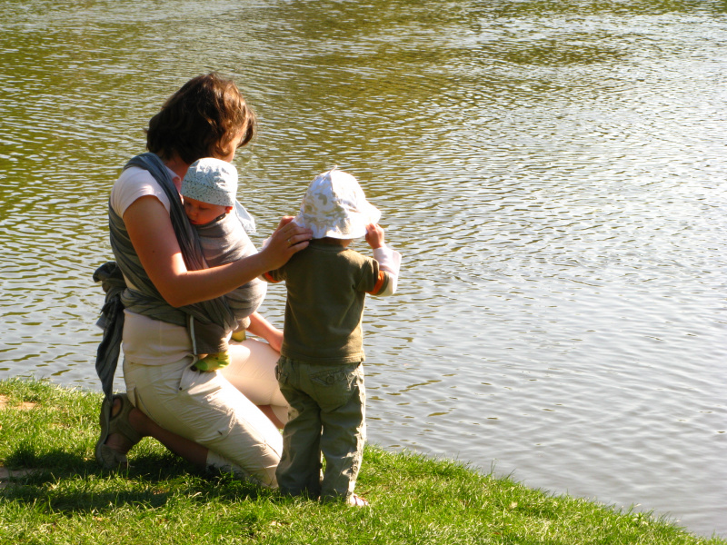 Stejně tak tomu bylo i u nás, na fotkách z roku 2009 je dvouletá dcera a půlroční syn. Chvíli jsme používali hluboký kočár pro syna a přídavné stupátko ke kočárku pro dceru, ale syn byl velmi nosící, pod kočárkem jsem neustále vozila šátek a často to dopadalo tak, že pár kroků od domu jsem ho musela navázat. Kočárek pak sloužil jen pro odložení nákupu. Často vznikaly komické situace, kdy jsem v jedné ruce tlačila kočár, za druhou ruku jsem vedla dceru, v šátku spal syn a lidé, kteří šli proti nám, se otáčeli do kočárku... a tam místo očekávaného dalšího miminka ležela taška s nákupem. Vzhledem k tomu, že manipulace s těžkým hlubokým kočárem mi už vadila, vrátila jsem se k lehkým skladným golfkám, které jsem používala před druhým porodem. V golfkách se dcera mohla venku i pohodlně vyspat, zatímco syn spinkal v šátku, a posloužily mi i jako přebalovací pultík, když jsem potřebovala odložit a přebalit.