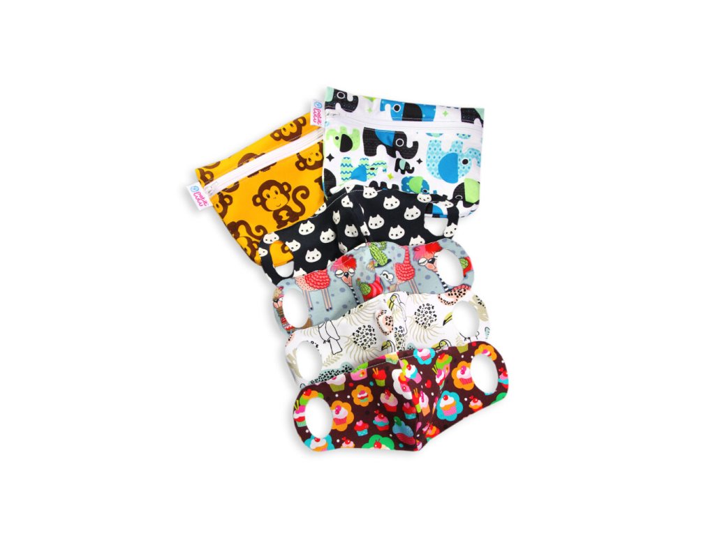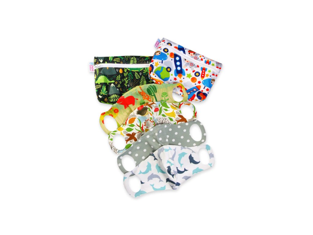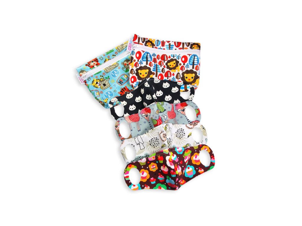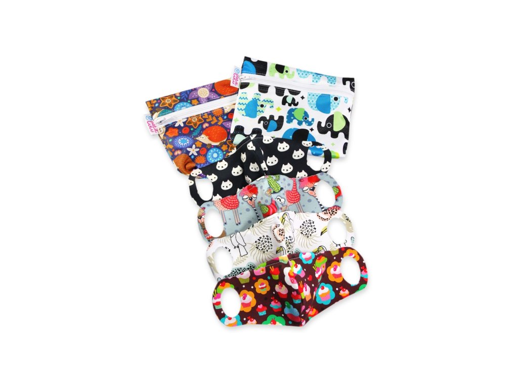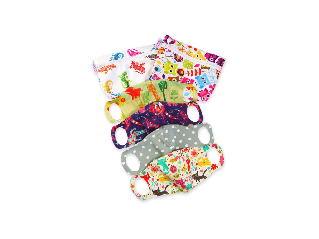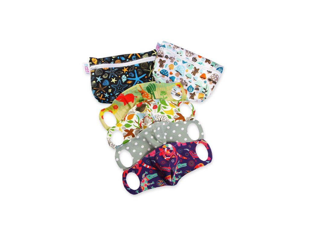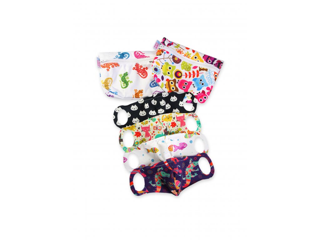 Praktická dětská sada pro školáky 4 roušky XXS + 2 taštičky (veselé sovičky, gekoni)