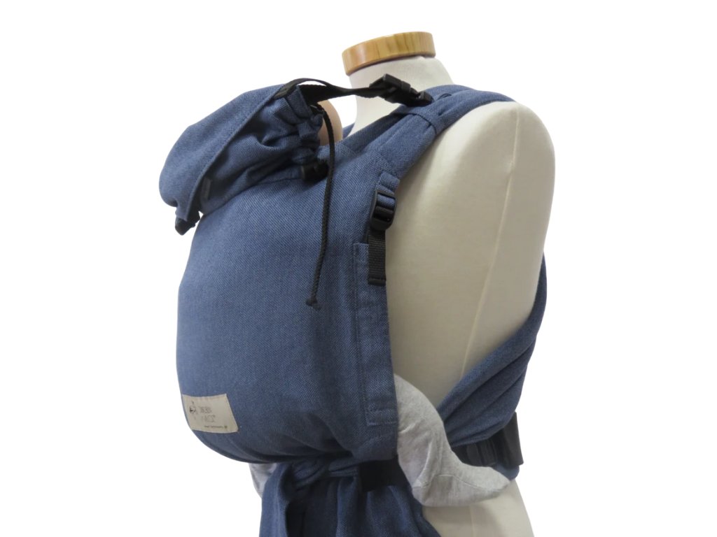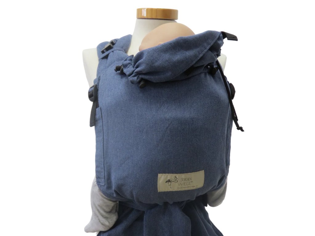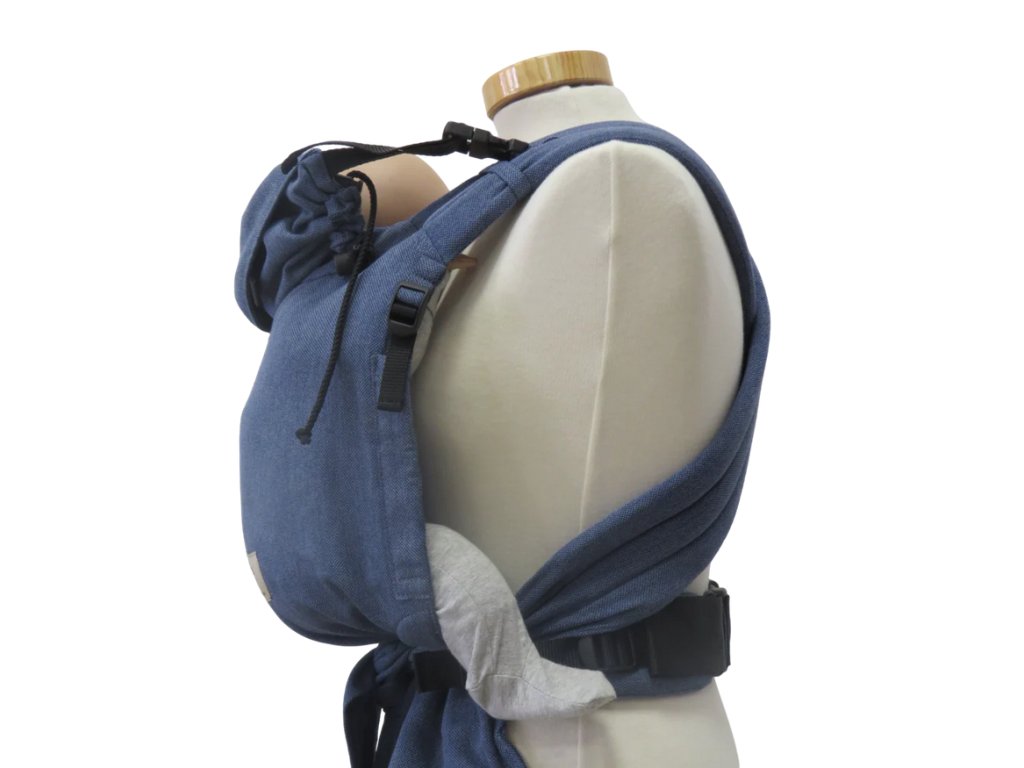 3) Třetí možností jištění je kapucka, která se pro novorozence kompletně stáhne a upevní jen na jednu přezku. Tím vytvoří diagonální oporu, která hlavičku zajistí, ale zároveň miminku umožní otáčet hlavu podle libosti, což je velmi důležité pro bezpečí při nošení.